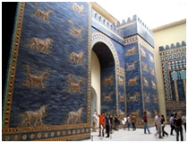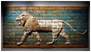 (left) A depiction of Inanna with a lion on a lead, from an Akkadian cylinder seal circa 2300-2150 Bce. (right) Lion wall tile design of Ishtar Palace, Babylon, from the Egyptian Museum, Munich. (below) the Ishtar Gate of Babylon, created during the reign of Nebuchadnezzar II, c.575Bce, featuring alternate lions, aurochs and ‘mushussu’, mythic ‘dragons’; the Berlin Museum, Germany.